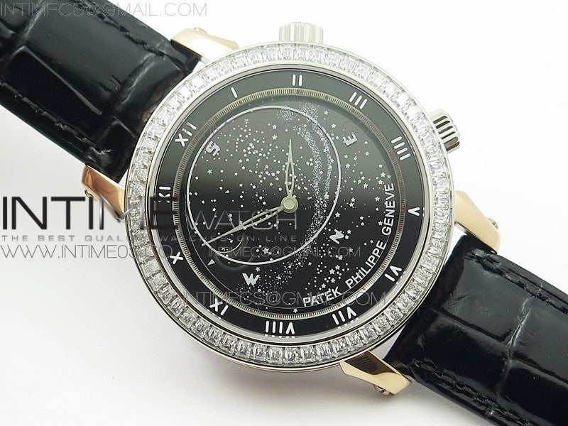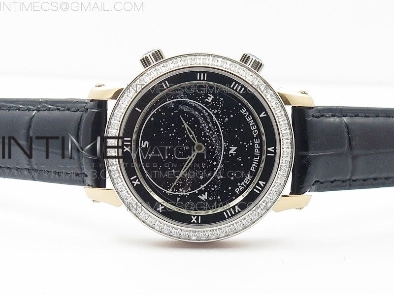 6104P Moon RG Black Dial Diamond Bezel on Black Leather Strap A240 V2