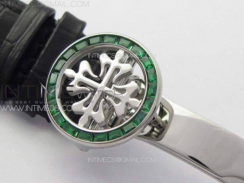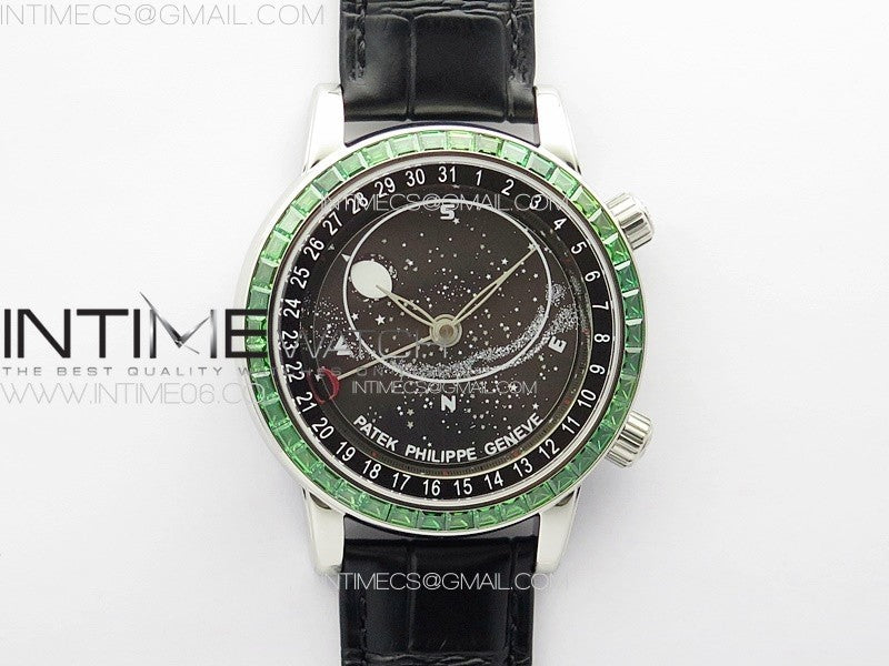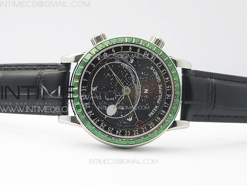 6104P Moon SS 3EF Best Edition Black Dial Green T Diamond Bezel on Black Leather Strap A240