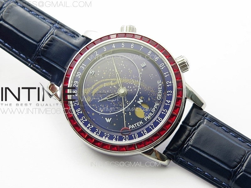 6104P Moon SS 3EF Best Edition Blue Dial Red T Diamond Bezel on Blue Leather Strap A240