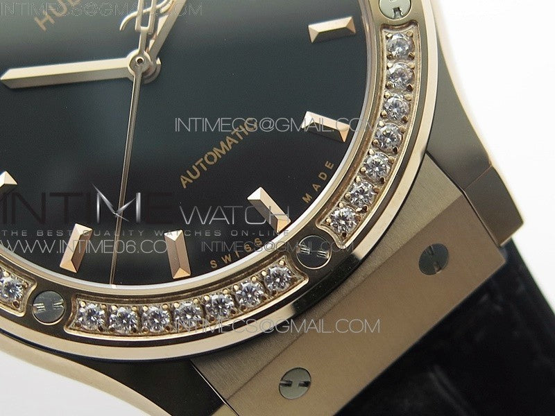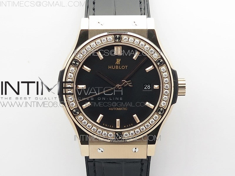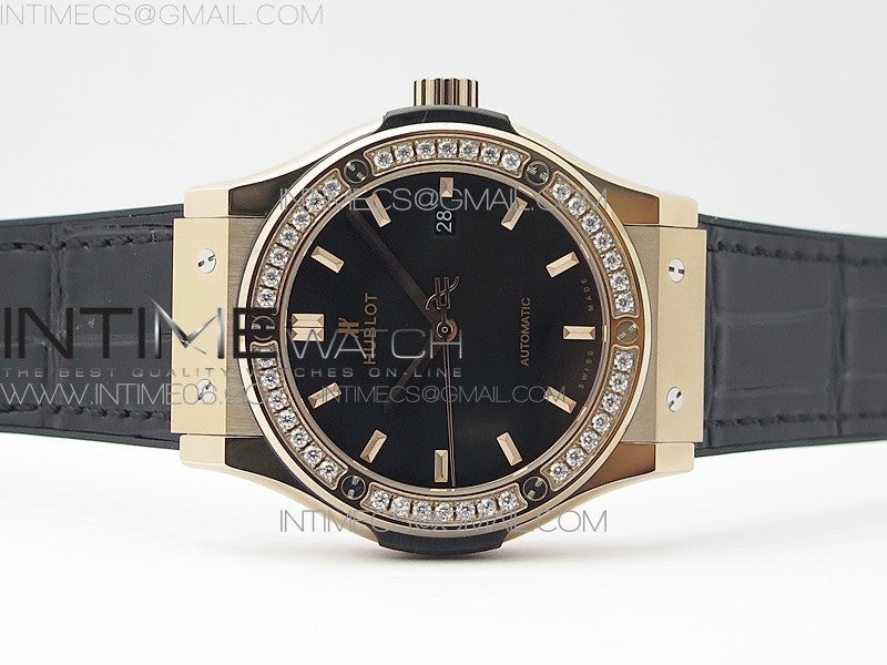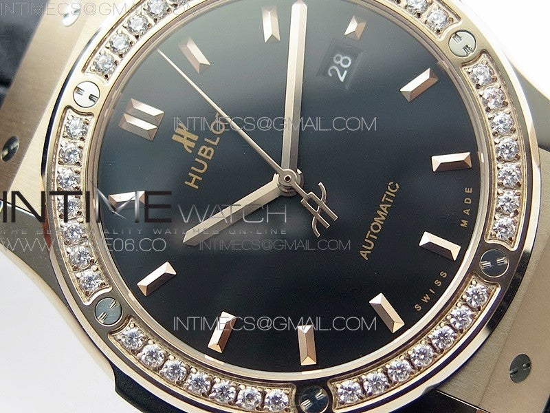 Classic Fusion 42mm RG Paved Diamonds Bezel B50F Black Dial On Black Gummy Strap A2892