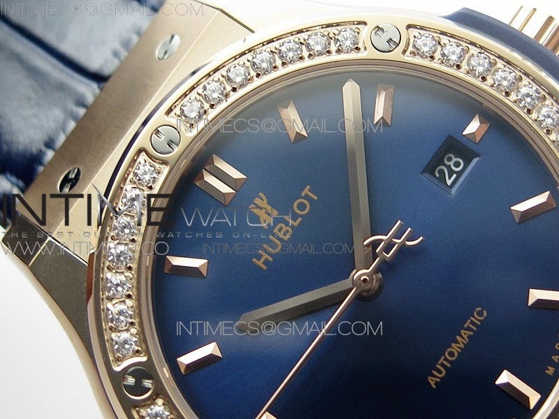 Classic Fusion 42mm RG Paved Diamonds Bezel B50F Blue Dial On Blue Gummy Strap A2892