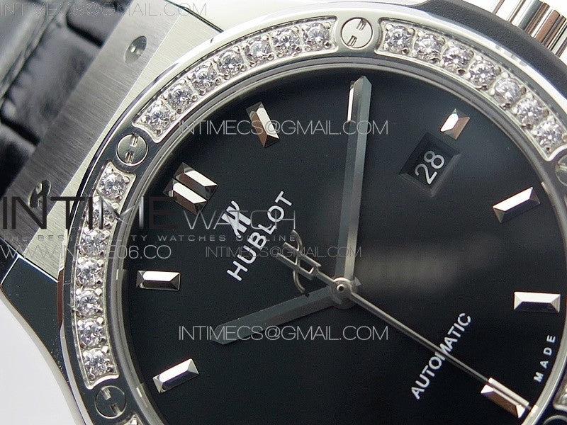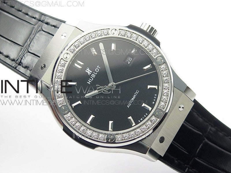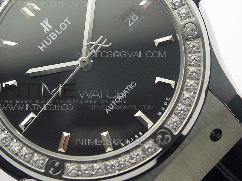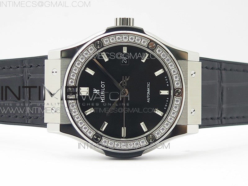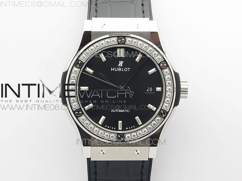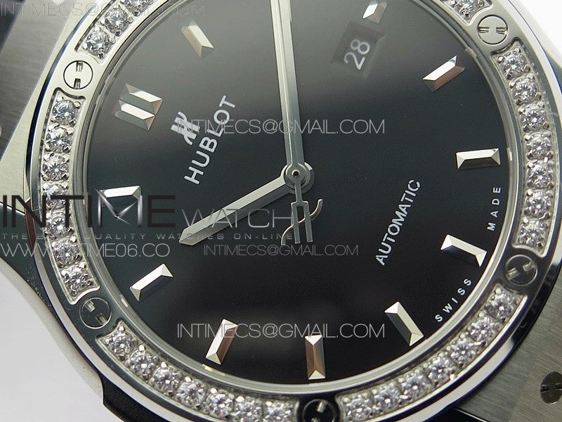 Classic Fusion 42mm SS Paved Diamonds Bezel B50F Black Dial On Black Gummy Strap A2892