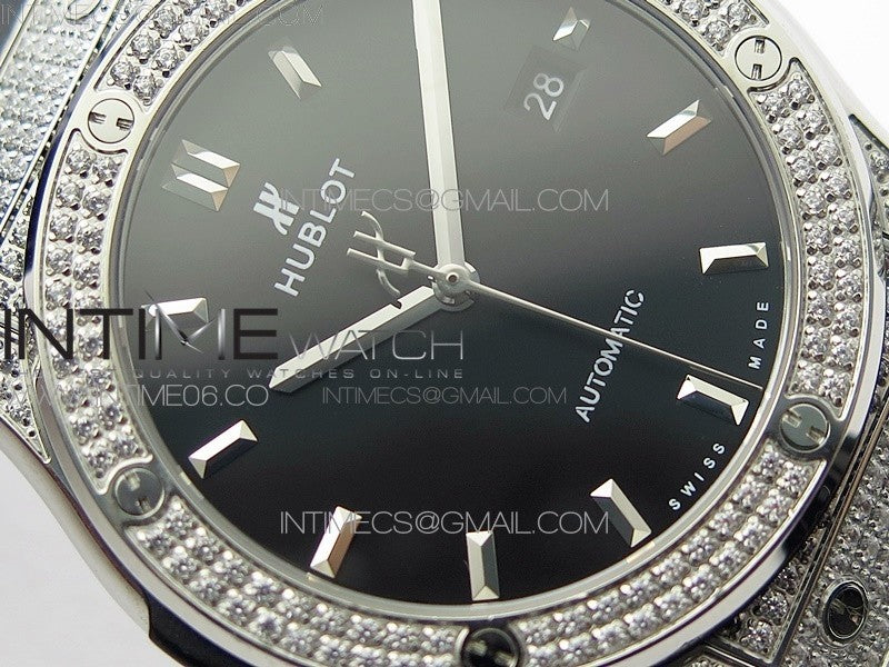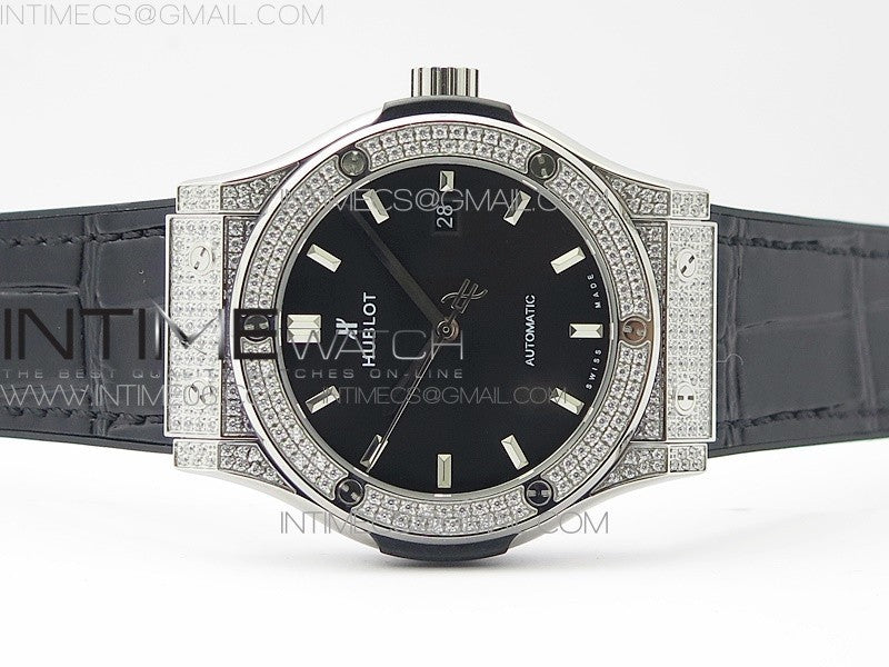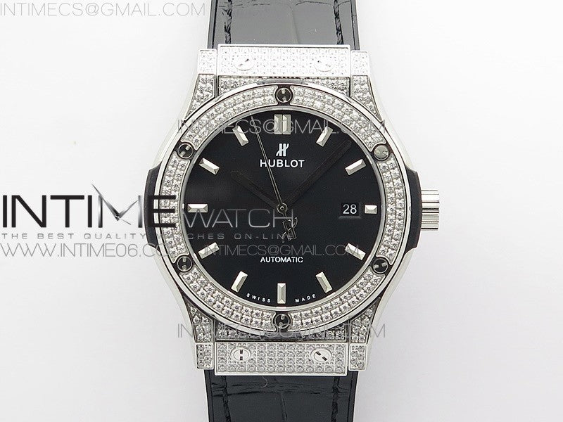 Classic Fusion 42mm SS Paved Diamonds Case/Bezel B50F Black Dial On Black Gummy Strap A2892