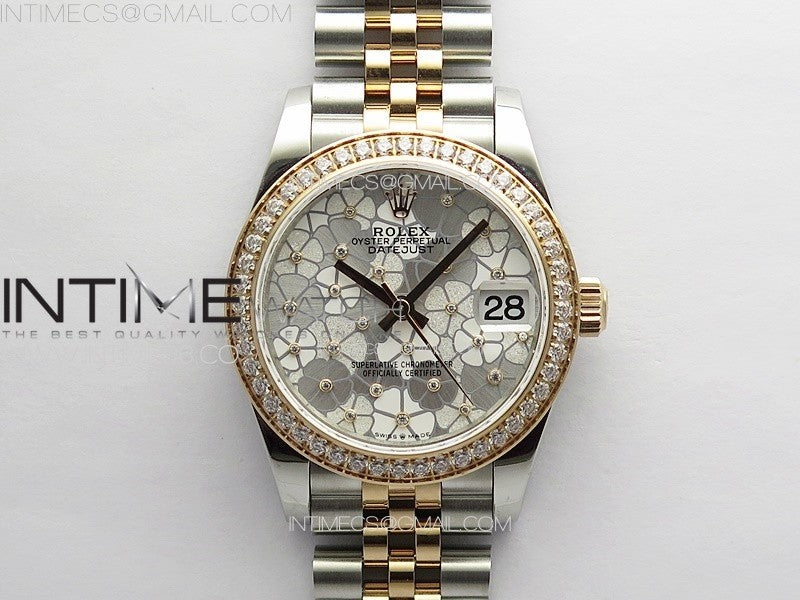 DateJust 31mm 278274 904L SS/RG Crystals Bezel GMF Best Edition Silver Flowers Crystals Dial on 904L SS/RG Jubilee Bracelet A2824